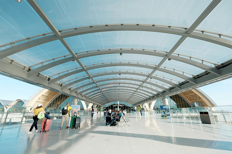 Vector Foiltec 的工作范圍包括設(shè)計、供應(yīng)和安裝 3,600 平方米的兩層 Texlon? ETFE 系統(tǒng)。由于連接橋形成了這座美麗機場的入口,Texlon? ETFE 系統(tǒng)將確保透明度,因此乘客在進(jìn)入橋下時仍然可以看到航站樓的全貌。除了透明度有益之外,ETFE 是輕量級的。因此,它包含比傳統(tǒng)玻璃覆層大得多的面板。這導(dǎo)致更少的鋼結(jié)構(gòu)和更高的能見度,同時保護乘客免受元素影響。減少鋼結(jié)構(gòu)設(shè)計還確保降低成本并減少對環(huán)境的影響。 Vector Foiltec 受委托設(shè)計和建造鋼結(jié)構(gòu),以確保結(jié)果既輕巧又優(yōu)雅。在設(shè)計 ETFE 時,團隊還必須考慮高風(fēng)載荷,在臺風(fēng)期間可能超過 200 公里/小時。